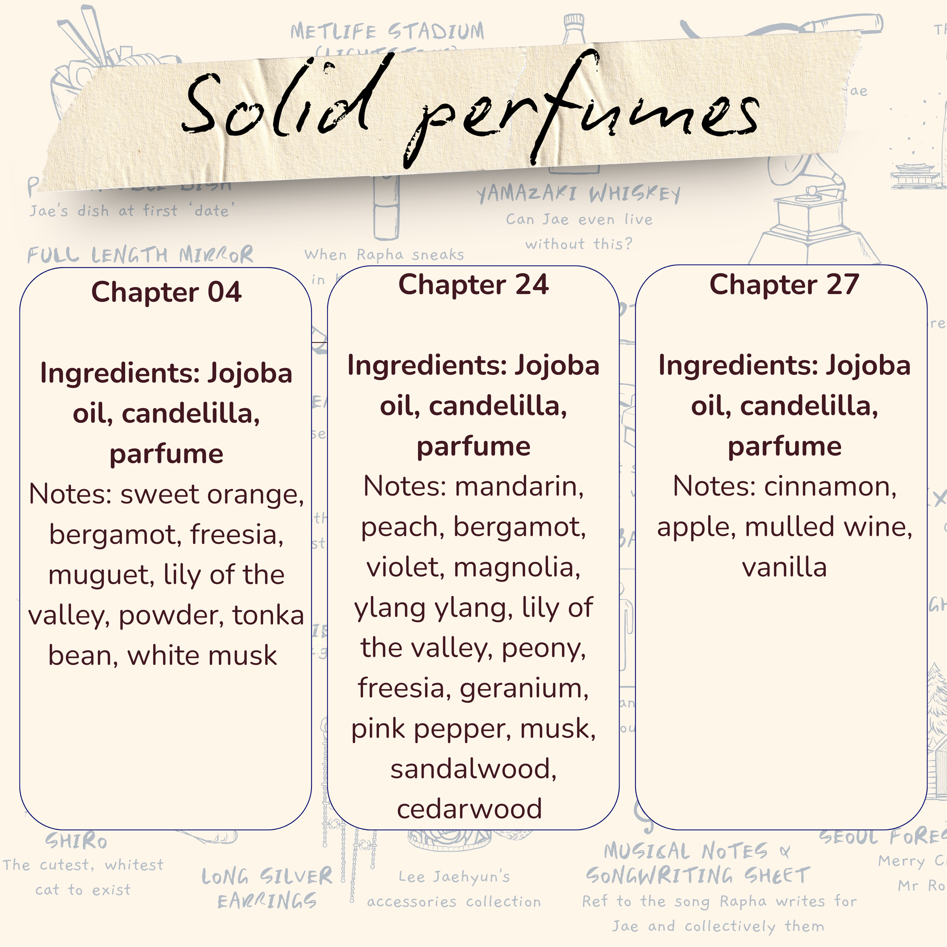 Each scent is inspired by scent notes in three different chapters.